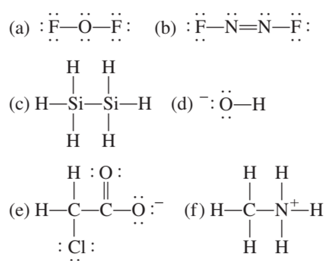 Tuliskan struktur Lewis untuk molekul dan ion: (a) OF2, ( b) N2 F2, ( c) Si2H6, ( d) OH2-, (e) CH2ClCOO2-, ( f) CH3NH1+